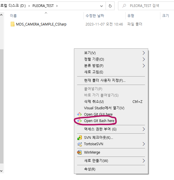 코드를 저장할 위치에서 '마우스 오른쪽 버튼' 클릭 - 'Open Git Bash here'을 클릭합니다.
